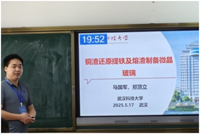 ▲武漢科技大學鄭頂立作題為“銅渣還原提鐵及尾渣制備微晶玻璃”的報告