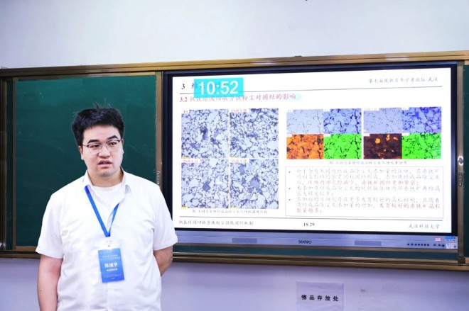 ▲武漢科技大學陳緒亨作題為“釩鈦球團回收含鐵粉塵強化固結機制”的報告