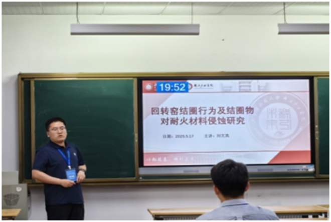 ▲內蒙古科技大學劉文英作題為“回轉窯結圈行為及結圈物對耐火材料侵蝕研究”的報告