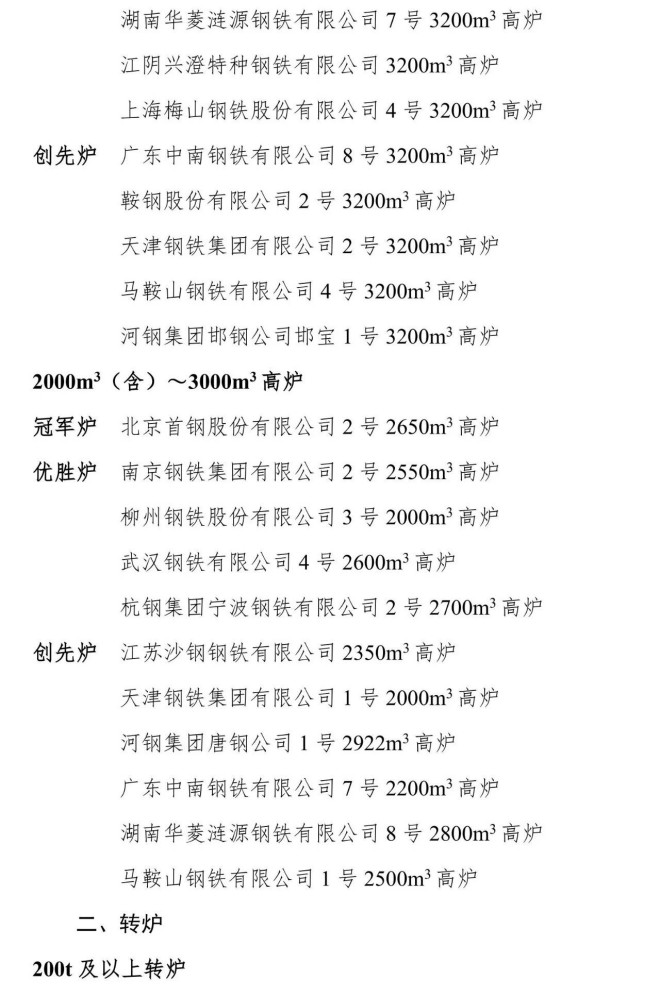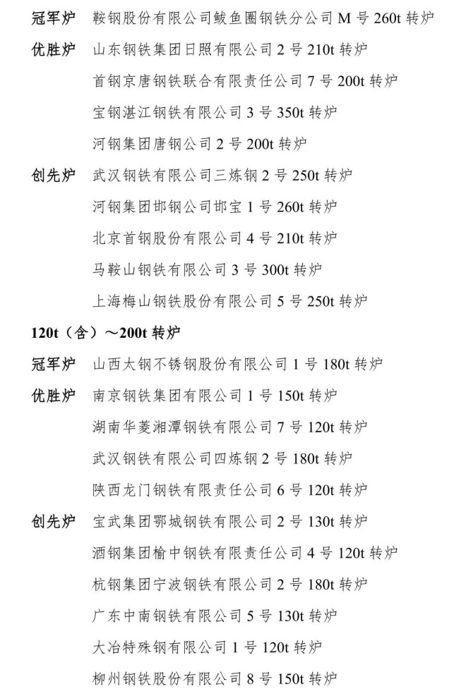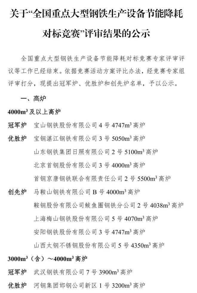 6月11日,中國鋼鐵工業協會發布全國重點大型鋼鐵生產設備節能降耗對標競賽評審結果公示。依據競賽活動方案評比辦法,經競賽專家組評審打分,提出冠軍爐、優勝爐和創先爐公示名單如下: