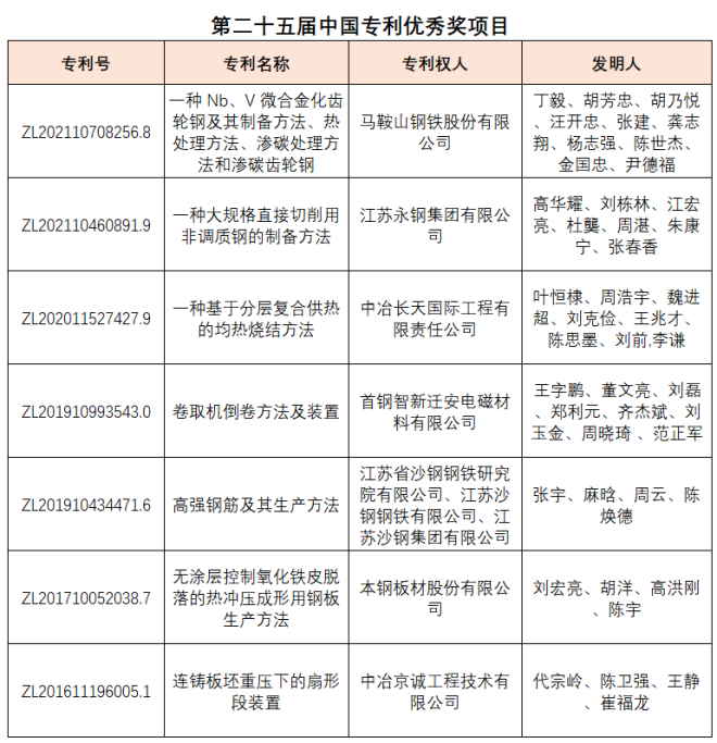 據統計,鋼鐵相關領域7項專利榮獲第二十五屆中國專利優秀獎,名單如下: