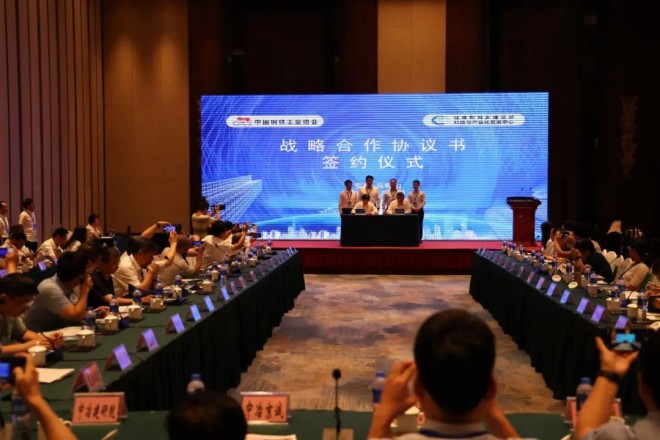 在簽約環(huán)節(jié),中國(guó)鋼鐵工業(yè)協(xié)會(huì)和住房城鄉(xiāng)建設(shè)部科技與產(chǎn)業(yè)化發(fā)展中心簽訂“兩行業(yè)聯(lián)合推動(dòng)鋼結(jié)構(gòu)建筑產(chǎn)業(yè)鏈協(xié)同發(fā)展”戰(zhàn)略合作協(xié)議。夏農(nóng)和張峰代表雙方簽約,與會(huì)代表共同見(jiàn)證。