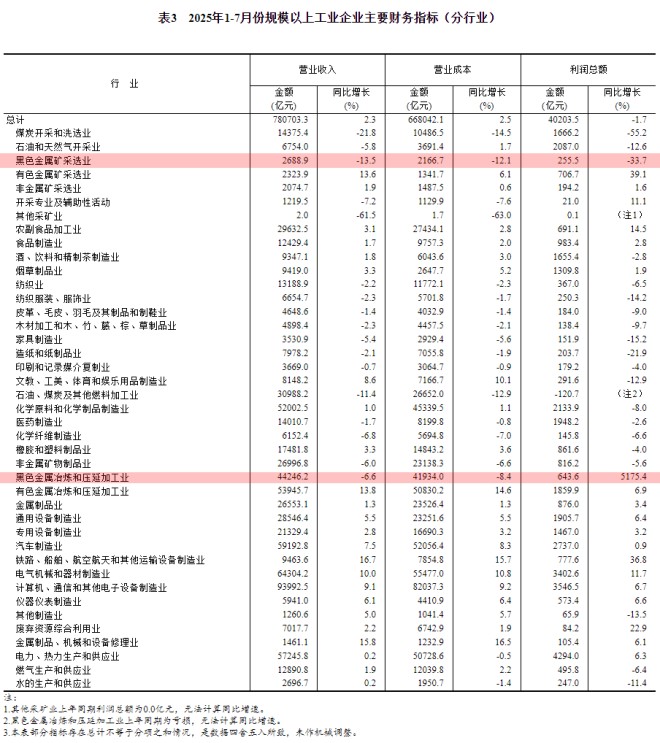 黑色金屬冶煉和壓延加工業(yè)1-7月份利潤總額643.6億元,同比增長5175.4%