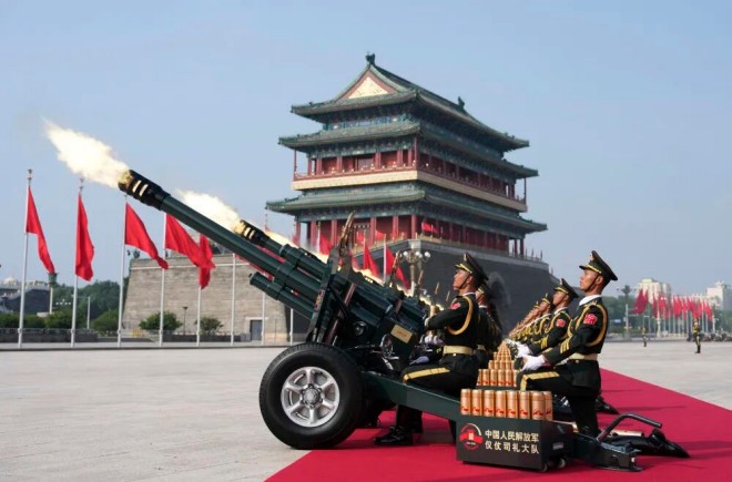 2025年9月3日,紀念中國人民抗日戰爭暨世界反法西斯戰爭勝利80周年大會在北京隆重舉行。這是禮炮在天安門廣場鳴響。新華社記者 牟宇 攝