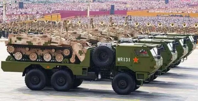 伴隨著激昂雄壯的軍樂聲,空中護旗梯隊、徒步方隊、戰旗方隊、裝備方隊、空中梯隊依次通過天安門廣場。20多個裝備方隊鐵甲奔涌、排山倒海、動地而來。數百臺地面裝備宛如一條鋼鐵巨龍。“鋼鐵洪流,勢不可擋。”“陸上猛虎,海上蛟龍。”“海天盾牌,御敵鎧甲。”“長纓在手,敢縛蒼龍。”“國之重器,壓艙基石。”“東風浩蕩,威震寰宇。”……多么氣勢磅礴、令人振奮的詞匯!看,坦克車、兩棲輪式裝甲突擊車、步兵戰車、自行榴彈炮、遠程火箭炮等陸上作戰裝備;紅旗系列艦空導彈、鷹擊系列反艦導彈、各式魚雷等海上作戰裝備;紅旗系列防空導彈、反導攔截彈、激光武器、微波武器等防空反導武器裝備;衛星通信等信息作戰裝備;無人反坦克車、機器狼、無人潛航器、無人作戰艇、無人機等無人作戰裝備;裝備搶救車等后勤保障裝備;長劍系列巡航導彈、鷹擊系列巡航導彈、東風系列彈道導彈、洲際彈道導彈、巨浪系列潛射導彈等戰略打擊武器;預警機、殲擊機、運輸機、轟炸機、加油機、教練機等空軍裝備……多么令人震撼的場面!尤其是“打擊范圍覆蓋全球”的東風-5C液體洲際戰略核導彈出場時,引起了全場經久不息的贊嘆。這樣的體系化作戰裝備,充分彰顯我軍新質戰斗力以及捍衛國家利益、維護世界和平的強大能力。
