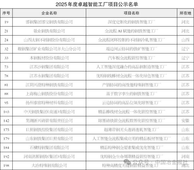 9月4日,工信部網(wǎng)站發(fā)布《關(guān)于2025年度卓越級智能工廠項目的公示》(以下簡稱《公示》)。據(jù)《中國冶金報》記者不完全統(tǒng)計,鋼鐵行業(yè)有17個卓越級智能工廠項目上榜,疊加今年初發(fā)布的首批19個項目,鋼鐵行業(yè)共計已有36家卓越級智能工廠。