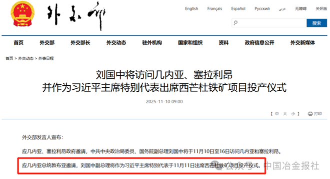 11月10日,外交部網站發布《劉國中將訪問幾內亞、塞拉利昂并作為習近平主席特別代表出席西芒杜鐵礦項目投產儀式》一文。