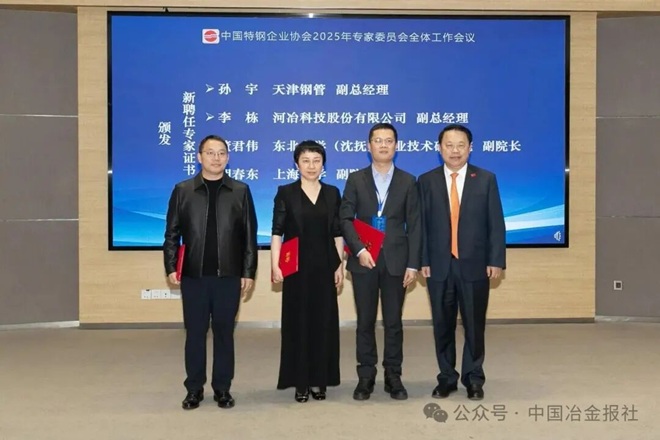 據悉,天津鋼管副總經理孫宇、河冶科技副總經理李棟、東北大學(沈撫)工業技術研究院副院長董君偉、上海大學(浙江)高端裝備基礎件材料研究院副院長胡春東等4人被聘為特鋼協專家委員會委員。