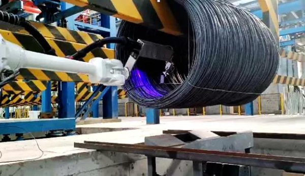 高端產品除了性能重要,尺寸精度也是客戶關注的重點。河鋼石鋼高品質線材產線采用先進的測徑儀,實現各個方向上的尺寸測量,動態在線測量精度可達±0.01mm,且一次完整的測量時間僅需0.15秒!真的是一眨眼的工夫了。還有產線上忙碌著的機器人也十分引人注目。比如打牌掛牌機器人,動作那叫一個穩、準、快。