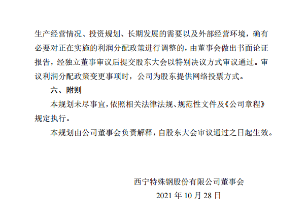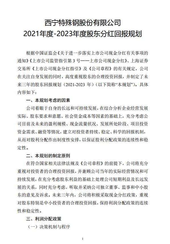 西寧特殊鋼股份有限公司2021年度-2023年度股東分紅回報規劃