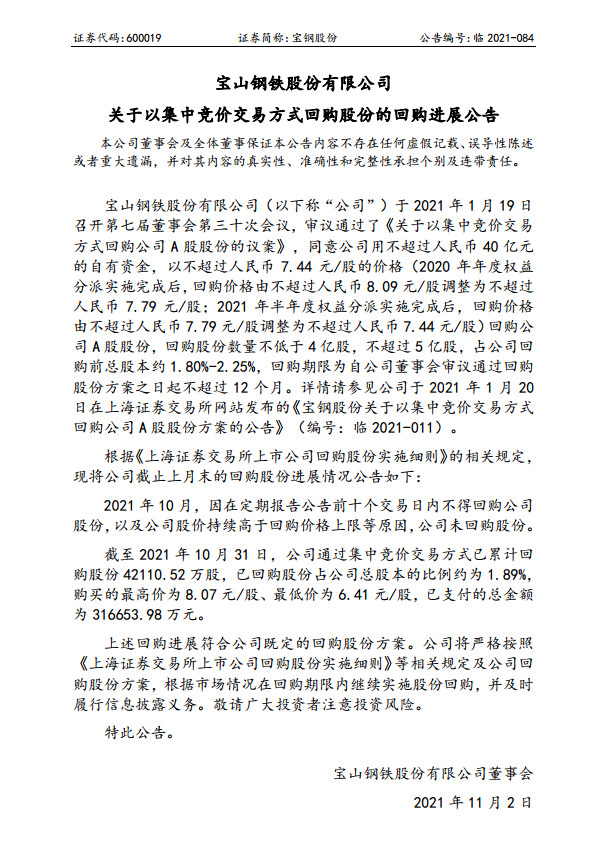 寶鋼股份關于以集中競價交易方式回購股份的回購進展公告
