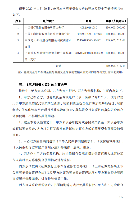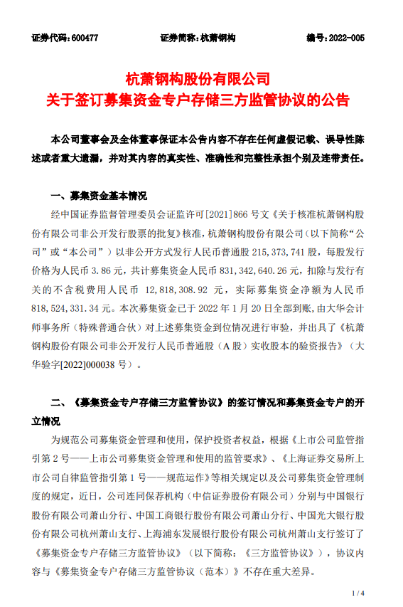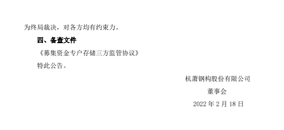 杭蕭鋼構關于簽訂募集資金專戶存儲三方監管協議的公告
