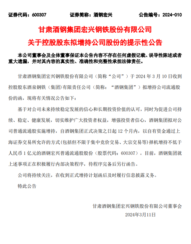 酒鋼宏興:酒鋼宏興關于控股股東擬增持公司股份的提示性公告