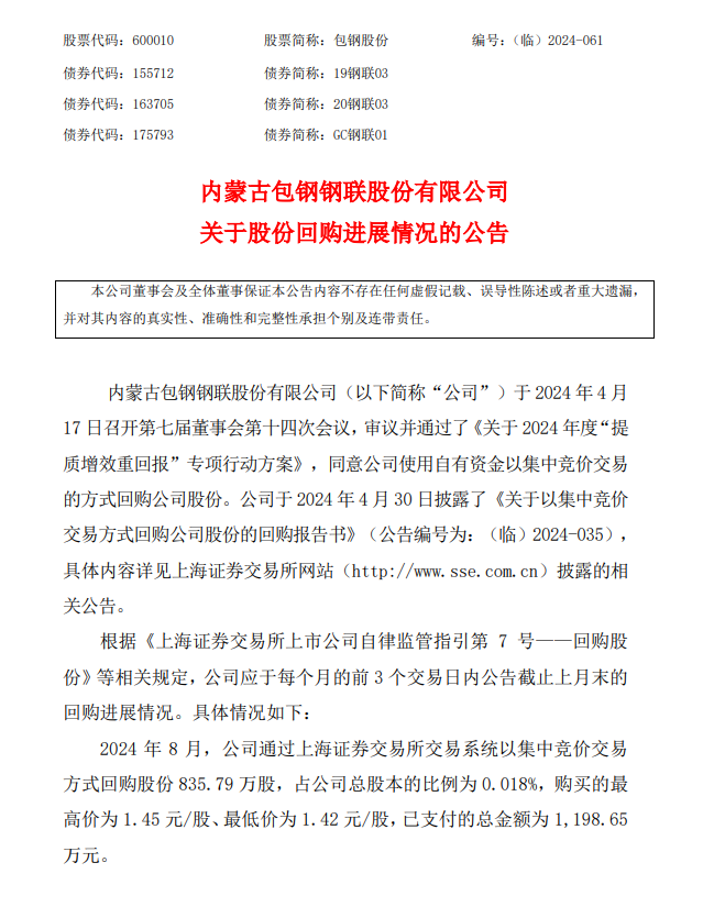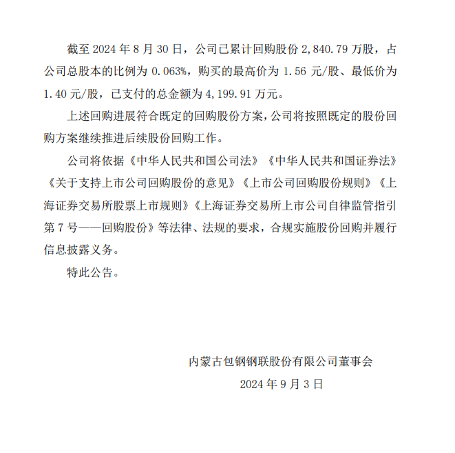 包鋼股份:包鋼股份關于股份回購進展情況的公告