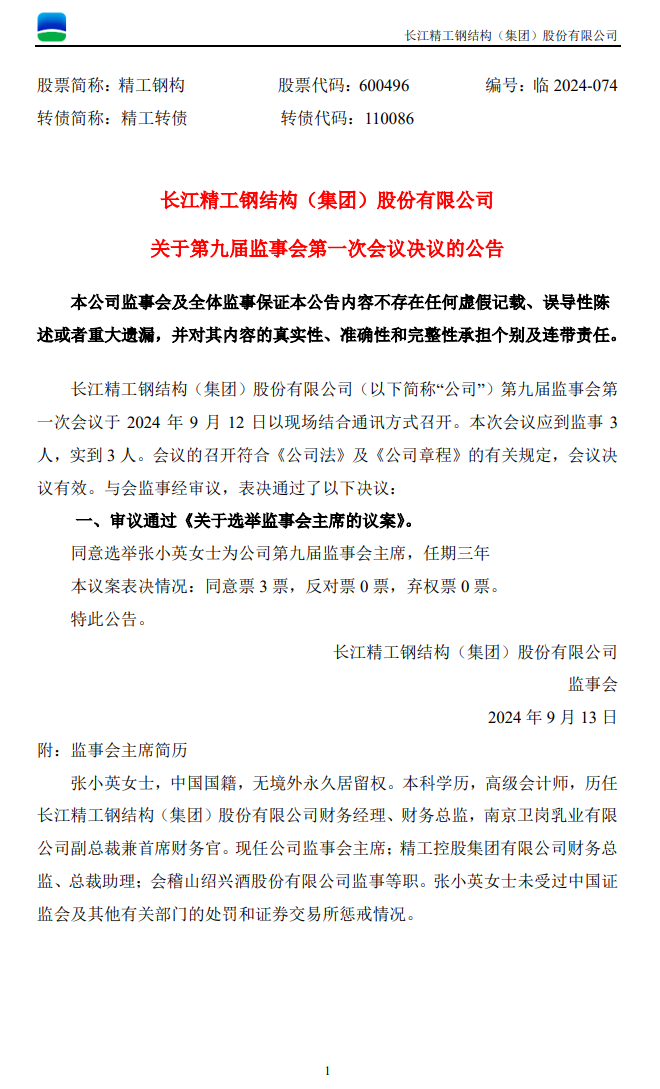 精工鋼構:精工鋼構關于第九屆監事會第一次會議決議公告