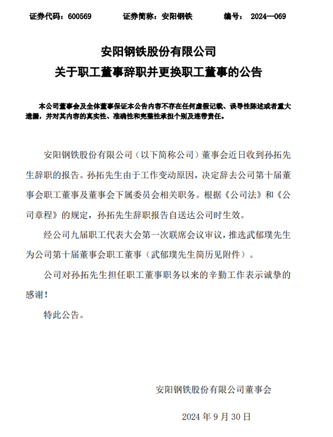 安陽鋼鐵:安陽鋼鐵股份有限公司關于職工董事辭職并更換職工董事的公告