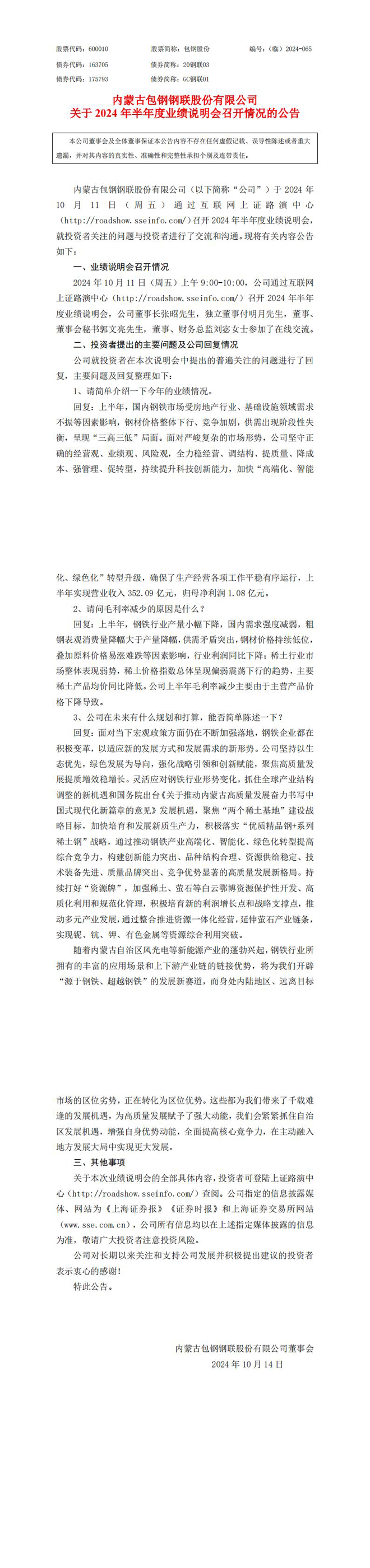 包鋼股份:包鋼股份關于2024年半年度業績說明會召開情況的公告