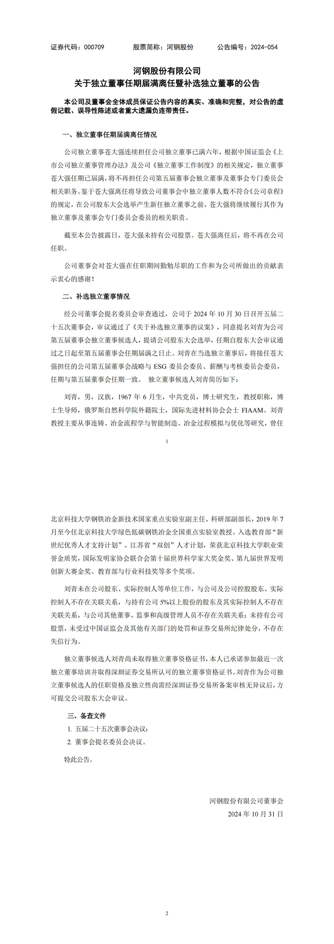 河鋼股份:關于獨立董事任期屆滿離任暨補選獨立董事的公告