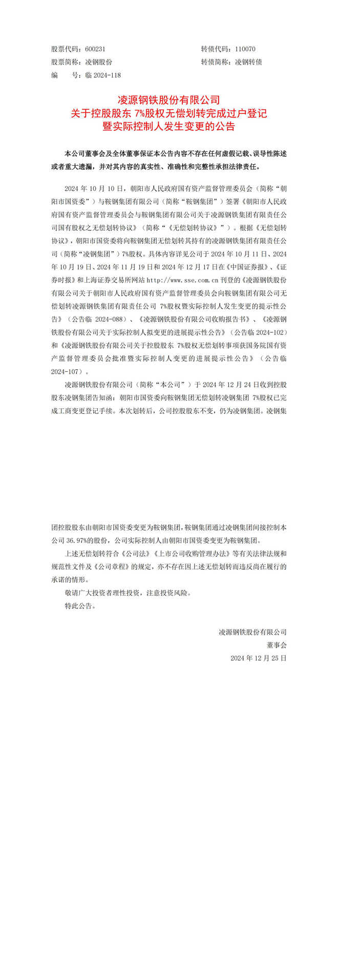 凌鋼股份:凌源鋼鐵股份有限公司關于控股股東7%股權無償劃轉完成過戶登記暨實際控制人發生變更的公告