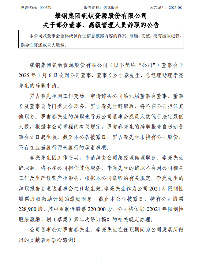 釩鈦股份:關于部分董事、高級管理人員辭職的公告