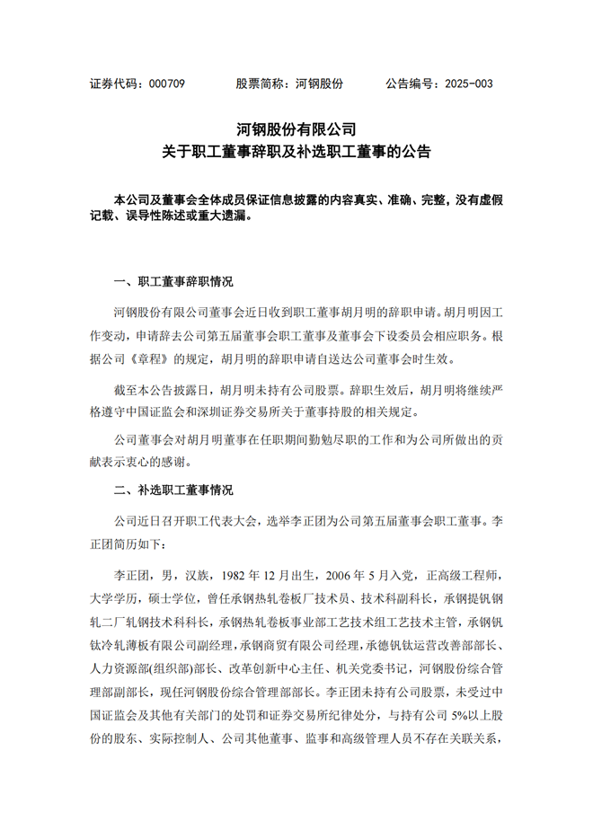 河鋼股份:關于職工董事辭職及補選職工董事的公告