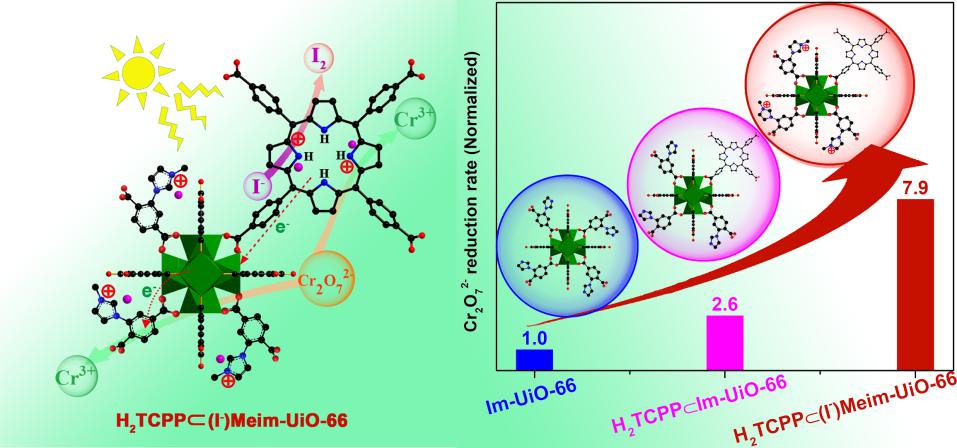 近日,中國(guó)科學(xué)院福建物質(zhì)結(jié)構(gòu)研究所結(jié)構(gòu)化學(xué)國(guó)家重點(diǎn)實(shí)驗(yàn)室曹榮和黃遠(yuǎn)標(biāo)團(tuán)隊(duì)在科技部重點(diǎn)研發(fā)計(jì)劃、國(guó)家自然科學(xué)基金項(xiàng)目、中科院戰(zhàn)略性先導(dǎo)科技專項(xiàng)、前沿科學(xué)重點(diǎn)研究項(xiàng)目及中科院青促會(huì)優(yōu)秀會(huì)員項(xiàng)目、國(guó)家留學(xué)基金委資助下,與日本國(guó)立材料研究所教授葉金花合作,將卟啉單元插入到穩(wěn)定的陽離子型多元MOF材料H2TCPP(I-)Meim-UiO-66中,由于該材料集寬可見光吸收能力的卟啉單元和強(qiáng)Cr2O72-吸附能力的陽離子結(jié)構(gòu)于一體,有效地提高了Cr2O72-的光還原能力,并達(dá)到了MOF基材料可見光還原Cr2O72-的最高速率(13.3mgCr(VI)/gcatalyst/min),遠(yuǎn)高于傳統(tǒng)MOF光催化劑,包括NH2-UiO-66(0.2mgCr(VI)/gcatalyst/min)和NH2-MIL-125(1.6 mgCr(VI)/gcatalyst/min)。結(jié)合實(shí)驗(yàn)表征和理論計(jì)算,作者提出了多元H2TCPP(I-)Meim-UiO-66對(duì)Cr2O72-的光還原機(jī)理。此工作表明,充分利用多元MOF中吸附和光敏性間的協(xié)同作用,可以有效提高光催化性能,并為設(shè)計(jì)更加高效的光催化材料鋪平了道路。上述結(jié)果發(fā)表在Applied Catalysis B: Environmental上(2019, 253, 323-330),文章第一作者是在讀博士研究生王旭生。
