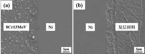 通過軋制復(fù)合工藝實現(xiàn)了“好鋼用在刀刃上”的理念。復(fù)合板集聚了基層和復(fù)層的優(yōu)點,不但有效利用了基層材料 8Cr13MoV 的高強(qiáng)度、高硬度等力學(xué)性能,同時又具有復(fù)層材料耐蝕性優(yōu)良、韌性好等特殊性能,既可以降低制備成本,又可以達(dá)到使用要求。