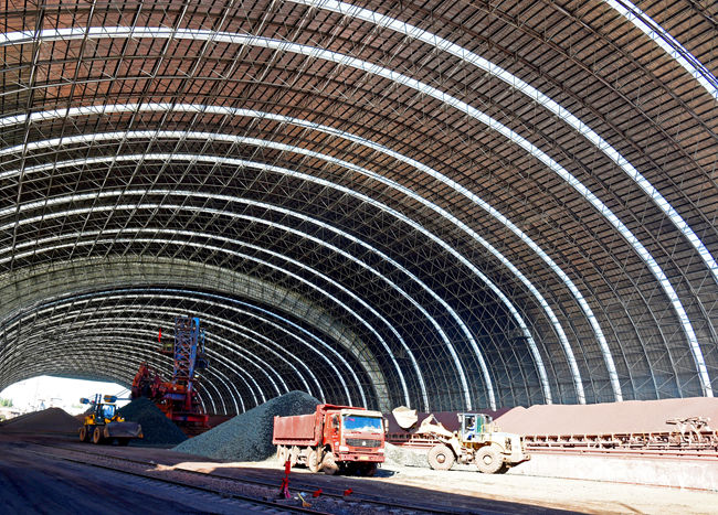 圖二:不銹鋼防塵大棚內(nèi),運(yùn)礦車輛有序作業(yè)。