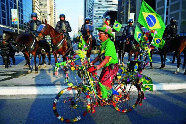 2014年巴西世界杯,一位球迷經(jīng)過交通管制的保利斯塔大街。(作者:EITAN ABRAMOVICH)