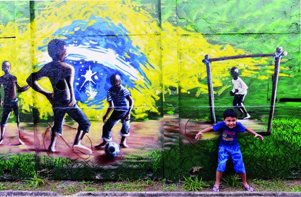 2014年6月,圣保羅一處涂鴉墻前快樂的男孩兒。(作者:胡金喜 )