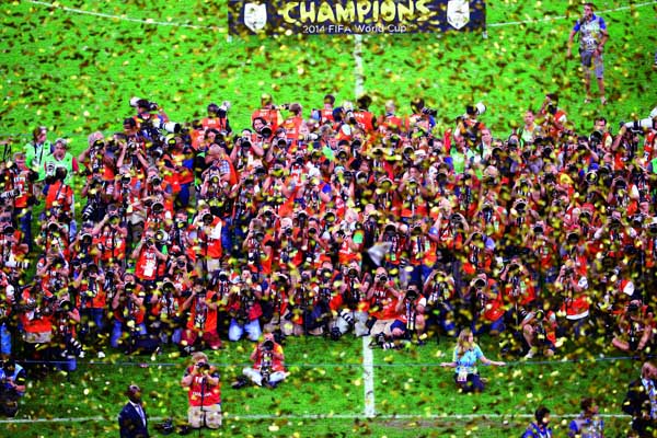 2014年7月12日,來自世界各地的記者們在里約熱內(nèi)盧拍攝獲得巴西世界杯冠軍的德國隊。(作者:劉占坤)