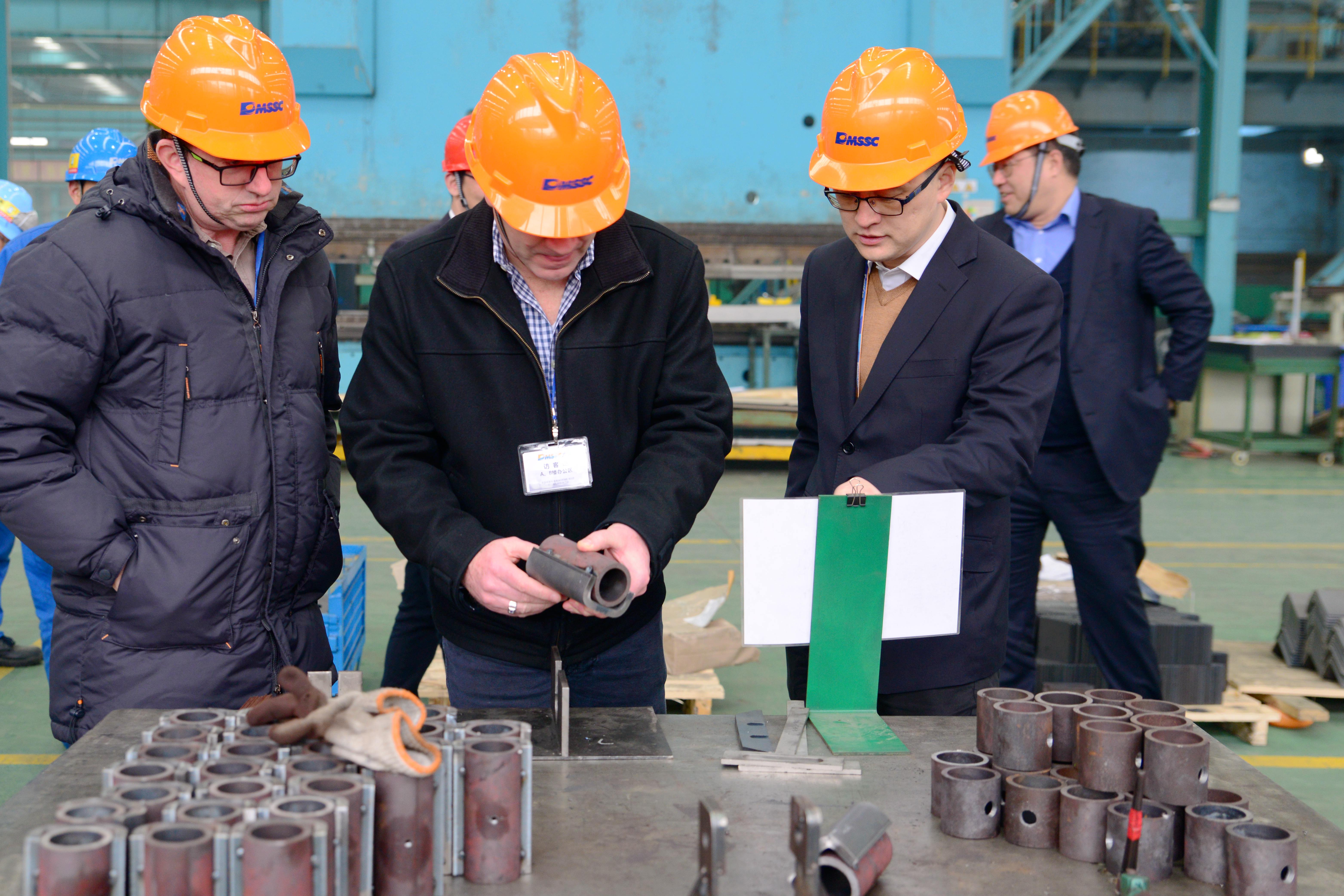 兩位美國商務(wù)代表考察拖車部件加工進(jìn)度。