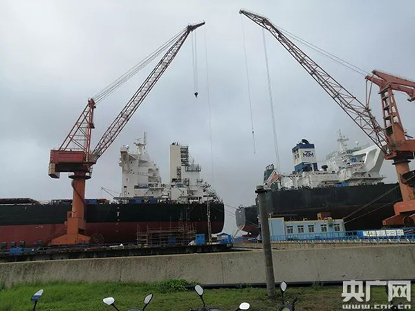 右側船舶為等待加裝脫硫裝置的船舶(央廣記者 佟亞濤 攝)