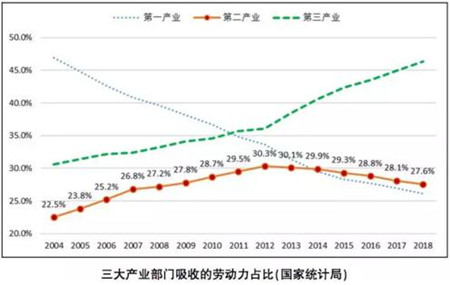 更為重要的是,在不斷減少的適齡勞動(dòng)力人口存量中,各個(gè)產(chǎn)業(yè)部門之間的競(jìng)爭(zhēng)日益激烈,特別是在互聯(lián)網(wǎng)技術(shù)的“加持”下,以家政、餐飲、快遞等服務(wù)業(yè)為代表的第三產(chǎn)業(yè)不斷擴(kuò)張,制造業(yè)工人不斷被分流。2018年,第三產(chǎn)業(yè)已經(jīng)吸收全國(guó)46.3%的就業(yè)人員,而制造業(yè)就業(yè)人員占比則從2012年的30.3%下滑到2018年的27.6%。同時(shí),制造業(yè)內(nèi)部輕工業(yè)和重工業(yè)之間也存在競(jìng)爭(zhēng),以船舶工業(yè)為代表的重工業(yè)在勞動(dòng)力市場(chǎng)上的吸引力較弱,年輕人更不愿從事這一行業(yè)。