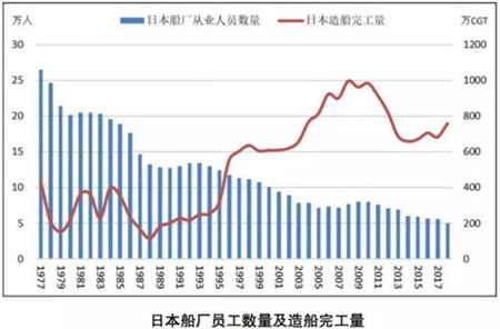 日、韓船企作為我國(guó)船舶工業(yè)的主要競(jìng)爭(zhēng)對(duì)手,在經(jīng)濟(jì)發(fā)展過程中也經(jīng)歷了造船工人不斷減少和勞動(dòng)力成本優(yōu)勢(shì)不斷下降的過程。但日、韓船企通過多種措施提高效率取得了一定效果。