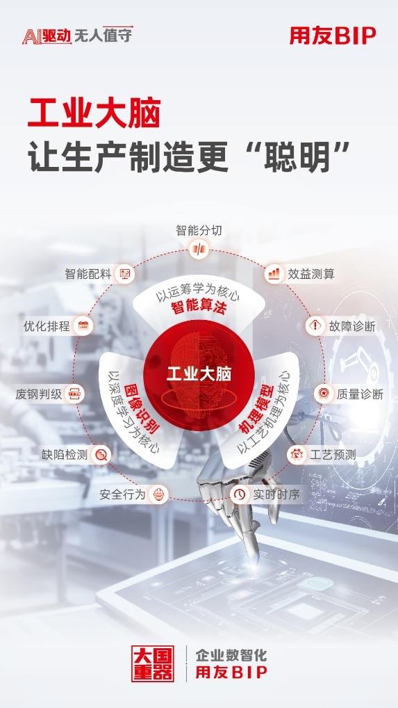 立足35年服務超290萬工業企業的經驗積淀,用友BIP工業大腦在行業應用場景和工業機理模型的基礎上,深度融入圖像識別與機器學習等技術 ,自主研發了“廢鋼判級”“智能配料”“優化排程”等300余個工業模型,將AI技術與業務場景融合,挖掘工業大數據價值,讓生產更簡單,質量更穩定,成本更低廉,決策更科學,加速普及工業智能在制造業的全面應用。