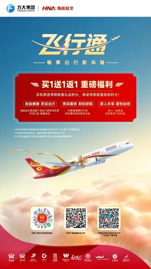 此外,為給商旅人群打造高品質出行體驗,近期新海航還重磅推出機票組合產品“飛行通”,以“買1送1返1”的創新產品形式,讓旅客獲得3倍價值權益,把傳統的航空運輸服務、金融服務與商旅出行鏈條的各個環節高度融合,通過創新產品、優化服務,以實際行動助力出行場景消費增長,促進消費繁榮。