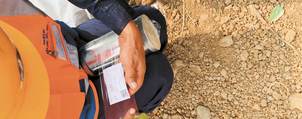 圖為中冶武勘的作業(yè)人員正在貼土樣二維碼標(biāo)簽。