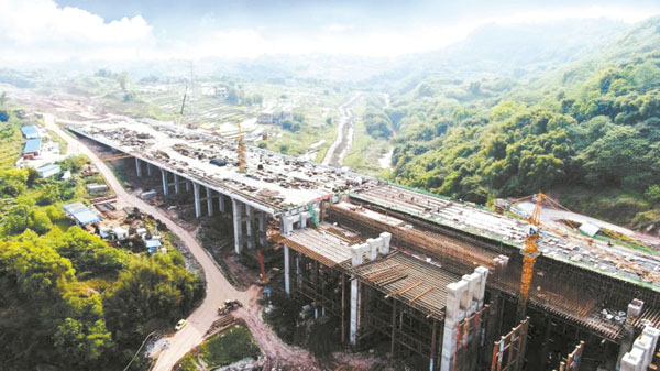圖為中國十九冶瀘州二環(huán)路(納溪段)項目K1+610跨倒流河大橋施工現(xiàn)場。 (陳星宇 攝)