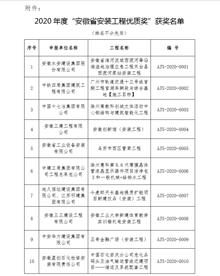 7月8日,安徽省安裝和機械設備協會公布了2020年度“安徽省安裝工程優質獎”獲獎名單,十七冶承建的滁州高教科創城文體活動中心工程成功上榜,榮獲“安徽省安裝工程優質獎”。