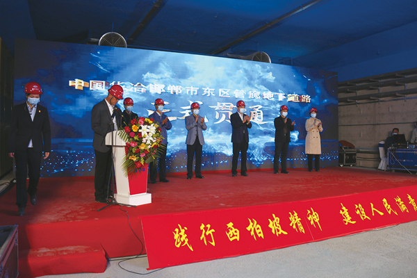 在辦實事、開新局環節,播放了邯鄲市東區管廊項目部建設成果展示視頻,視頻從項目準備到策劃再到建設大干,通過幾年的艱苦鏖戰,順利實現地下道路全面貫通,建設取得重要階段性成果。一幕幕精彩的瞬間,展示出了中國華冶建設者秉持“一天也不耽誤、一天也不懈怠”的中冶精神,以“馬萬水精神”“西柏坡精神”為引領,所取得的新成果,為邯鄲經濟發展提供了有力支撐。現場與會領導還參加了地下道路貫通儀式。