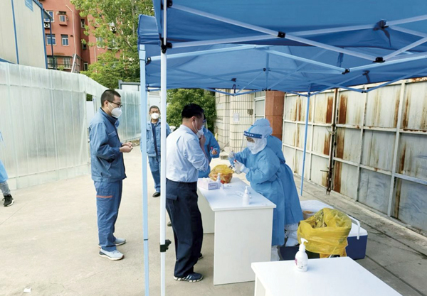 圖為中冶寶鋼項(xiàng)目部員工正在做核酸檢測(cè)。