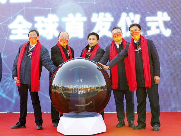 圖為在全球首發(fā)儀式上,與會(huì)領(lǐng)導(dǎo)和嘉賓共同啟動(dòng)發(fā)車指令。(中冶寶鋼 供圖)