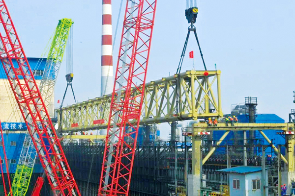圖為河北華豐焦?fàn)t煙氣治理建筑安裝項目鋼桁架吊裝現(xiàn)場。 (中國五冶 供圖)