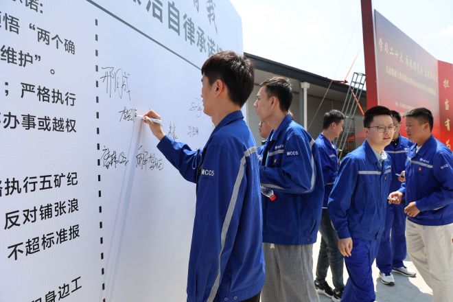 4月26日下午,“學習二十大、永遠跟黨走、奮進新征程”五四青年節主題活動在銀湖安置房項目現場拉開序幕。團員青年有序進場,依次在“清廉華東 青廉有我”廉潔自律承諾墻上簽名,并鄭重作出承諾。