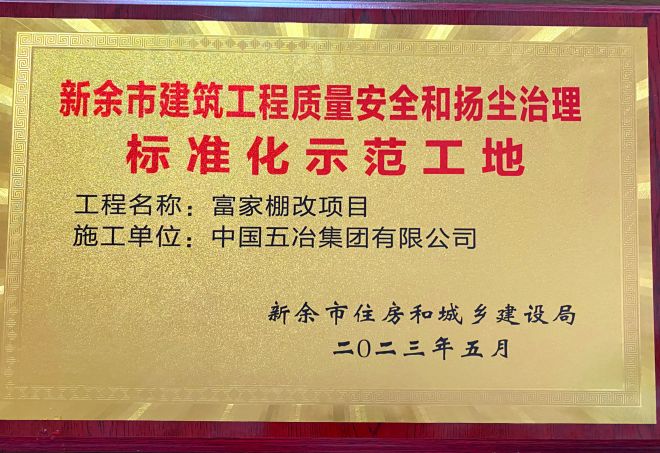 5月9日,新余市住房和城鄉(xiāng)建設(shè)局組織召開“2023年度第一批建筑施工質(zhì)量安全和揚塵治理標準化示范工地觀摩會”。會上,中國五冶新余富家棚改項目被授予“新余市建筑工程質(zhì)量安全和揚塵治理標準化示范工地”榮譽獎牌。