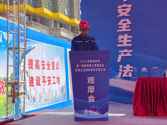 觀摩會現(xiàn)場播放了新余富家棚改項目等8個質(zhì)量安全和揚塵治理標準化示范工地的宣傳視頻。新余富家棚改項目位于新余市北湖片區(qū),占地面積11263.77平方米,總建筑面積46440.90平方米,高層住宅樓26層,地下車庫2層,是新余市推動新型城鎮(zhèn)化的重要民生工程。