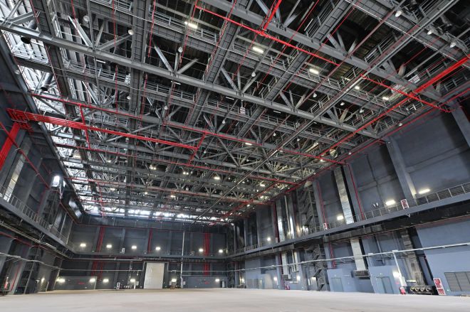 為保證地坪施工質(zhì)量,項目部成立了技術攻關小組,扎進施工一線,通過實地勘察確定了道路虛鋪厚度、壓實系數(shù)等參數(shù),并開展“頭腦風暴”,確定了分塊跳倉、二次激光找平、分塊拋光打磨等多項工序的最佳方案。分塊跳倉施工法分縫合理,可根據(jù)實際情況進行間隔作業(yè),實現(xiàn)嚴控混凝土溫差,有效減少收縮裂縫的產(chǎn)生;運用激光整平機等先進設備嚴格控制平面標高和攤鋪厚度,提升地坪平整度;利用專用磨光機,對每一寸地坪精打細磨,配合養(yǎng)護措施獲得更好的光澤度。由于地坪工程量大、精度要求高,施工現(xiàn)場長期需要數(shù)十名施工人員作業(yè),同時管理人員也要分區(qū)旁站,實時掌控施工的安全質(zhì)量情況,燈火通明的施工區(qū)、辦公區(qū)也就成了夜晚的常態(tài)。經(jīng)過全體人員的共同努力,地坪施工順利通過驗收,高質(zhì)量完成了各項目標。