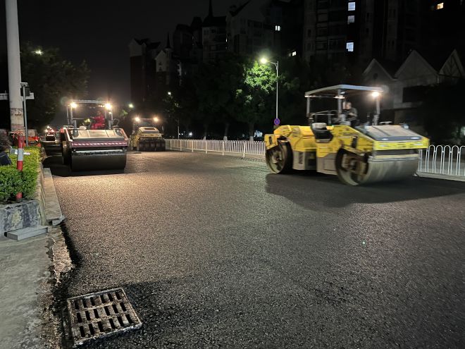自2023年3月開工以來,面對工期緊張、邊通車邊施工以及雨季等難題,項目團隊倒排工期,掛圖作戰,抓好工序銜接統籌安排,全力加快工程進度。為確保工程質量和安全,項目部有針對性地研究制定各項專題方案與應急預案。尤其是在瀝青攤鋪階段,為確保一次成優,項目部多次研究攤鋪方案和交通疏導方案,時刻關注天氣情況,根據天氣動態調整施工計劃,施工前加強安全、技術交底和機械設備性能檢測和隱患排查,施工中通宵達旦嚴密監測各項數據,最終實現了一次成優。