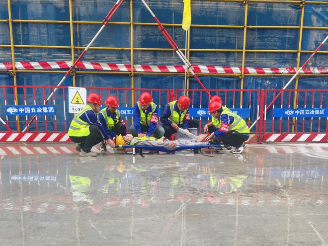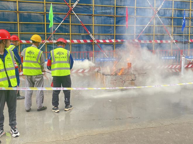 隨后,項目現場開展了消防演練和高處墜落救援演練。演練首先模擬了因工人操作不當引發火災,演練總指揮接到管理人員的火情報告后立即啟動應急預案,組織進行搶險工作。在警戒疏散組、通訊組、搶險組以及后勤醫療組的密切配合下,“火勢”迅速得到控制,火情被及時消除。與此同時,由于操作失誤,一名工人從高處意外墜落,現場管理人員了解情況后第一時間上報事故情況。接到事故報告后,項目部立即展開高處墜落救援工作,第一時間疏散救援通道,聯絡救治醫院,及時排除周邊環境可能帶來的二次傷害,并由專業人員進行初步救治,最終該名工人及時送至醫院接受治療。演練過程對接順暢、有條不紊,達到了預期效果。